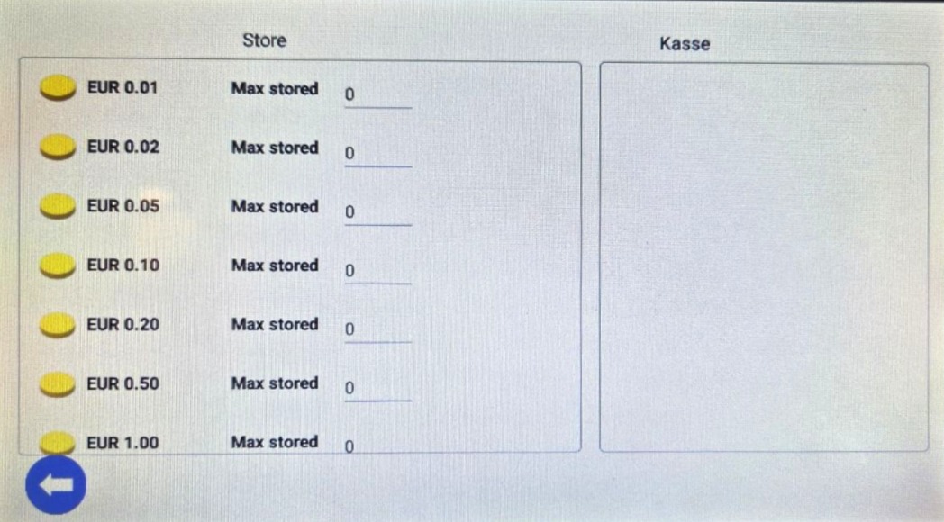 - Für diese Münzen kann ein maximaler Bestand festgelegt werden ("Max stored"). Wenn dieser Bestand überschritten wird, wird jede weitere Münze, die eingezahlt wird, direkt in die Abwurfbox geworfen.