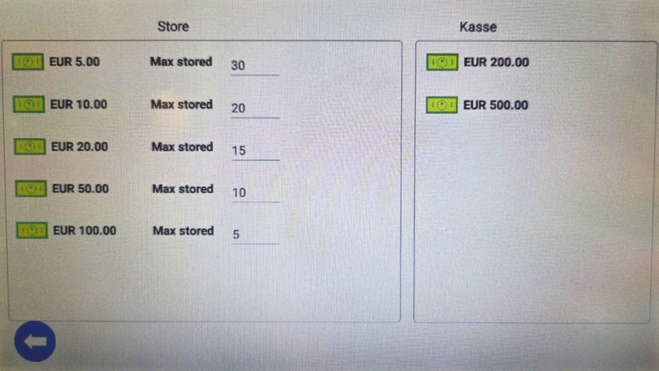 - Für diese Scheine kann ein maximaler Bestand auf dem Scheinwechsler festgelegt werden ("Max stored"). Wenn dieser Bestand überschritten wird, wird jeder weitere Schein, der eingezahlt wird, direkt in die Abwurfbox geworfen.
